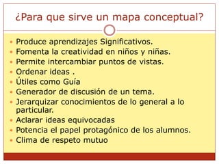 ¿Qué Es y Para Qué Sirven Los Mapas Conceptuales?【Importancia】 Los mapas conceptuales sirven para representar y organizar en un gráfico el conocimiento que estamos obteniendo sobre un tema específico. Esto se logra uniendo y conectando entre sí, ideas de un tema hasta formar una red de conceptos. el uso y para que sirven los mapas conceptuales by jeisson ... Como funcionan los mapas conceptuales que es? que es? que es el mapa conceptual Un mapa conceptual es una herramienta de aprendizaje basada en la representación gráfica de un determinado tópico a través de la esquematización de los conceptos que lo componen. Estos conceptos son