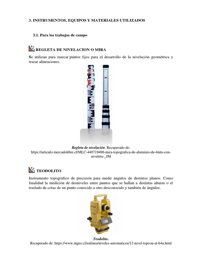 Instrumentos topográficos Usos y tipos Este instrumento topográfico brinda orientación gracias a que tiene una aguja imantada. A su vez, esta aguja señala el norte magnético de la Tierra. Igualmente, también posee dos círculos graduados, con los que ayudados con lentes de miden los ángulos. Para qué sirve el taquímetro topográfico? - Instrumentos... Un taquímetro es un instrumento topográfico ideado para medir rápidamente, distancias, ángulos elevaciones de objetos y posiciones relativas con gran precisión. Además, de hacer un cálculo exacto del desnivel...