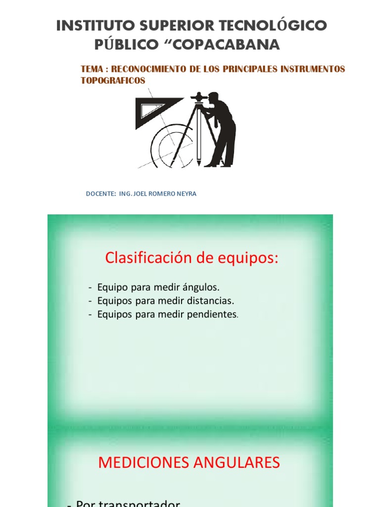 Instrumentos para Medir ÁNGULOS 【 Lista Completa 2022 】 ¿Sabías con que instrumento se miden los ángulos? Si buscas un Instrumento para Medir Ángulos aquí los tenemos TODOS. Al igual que el compás es el instrumentos para medir ángulos más usado, este también es un semicírculo, el cual está capacitado para medir ángulos de hasta... 100 terminos topograficos Altura de instrumento : el centro del eje de cualquier instrumento topografico sobre el punto que esta observado. Azimut : angulo que se forma en linea con la direccion Angulos : porcion definida del plano limitada por dos lineas que parten del mismo punto cuya abertura puede medirse en grados. El equipo topográfico para medir ángulos, el teodolito Esta herramienta que forma parte del equipo topográfico para medir ángulos se trata de una aguja imantada la cual señala el Norte magnético. El teodolito, al igual que el tránsito, se trata de un instrumento de medición de ángulos verticales y horizontales con una gran precisión.